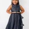 This stunning black lehenga set is designed with elegant white stripes that create a graceful flow. The sleeveless blouse features a modern cut-out style in the front and a chic lace-up back for a perfect fit. The flared skirt adds volume and charm, making it an ideal pick for festive occasions and cultural celebrations. Pair it with chunky bangles or a dupatta for a complete traditional look with a contemporary twist.
